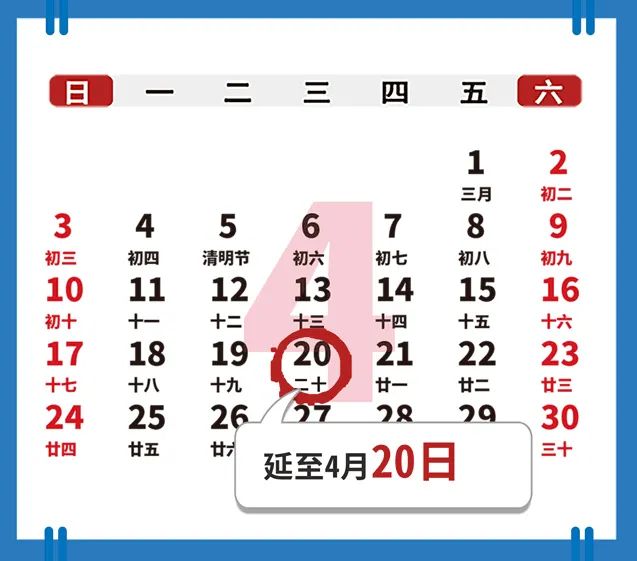 4月3日至5日放假3天,4月申报纳税期限顺延至4月20日。
